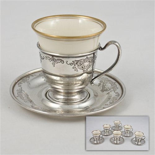 Georgian Shell by FM Whiting Sterling Demitasse Cup Saucer Set Active Pattern No Circa 1948 Manufacturers B171 Manufacturers Hallmark Size Saucer 3-78 Diameter Cup w Liner 2-58 High 3 Wide Lenox Liners Included Smaller sized cups and saucers used with after dinner refreshme